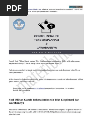 Contoh Soal Teks Eksplanasi Pilihan Ganda dan Kunci Jawaban Teks Eksplanasi Explanation Text merupakan sebuah teks yang berisi tentang proses-proses yang berhubungan dengan fenomena-fenomena alam sosial ilmu pengetahuan budaya dan lainnya. Contoh Soal Teks Eksplanasi Pilihan Ganda dan Kunci Jawaban Teks Eksplanasi Explanation Text merupakan sebuah teks yang berisi tentang proses-proses yang berhubungan dengan fenomena-fenomena alam sosial ilmu pengetahuan budaya dan lainnya. Temukan bank soal lengkap dan update dengan cara mendaftar gratis.
