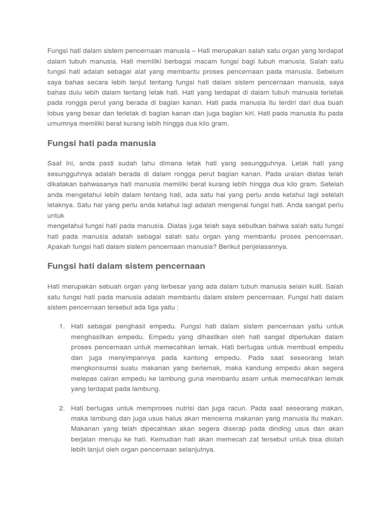 Hati merupakan organ yang memiliki berbagai fungsi salah satunya pada sistem pencernaan. Fungsi Hati Beberapa orang sehat mungkin tidak tahu apa yang dilakukan hati atau hati untuk kesehatan secara umum. Beberapa fungsi hati termasuk menghancurkan racun dalam darah memproduksi protein dan membantu proses pencernaan.